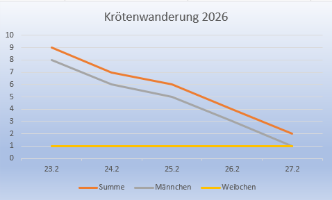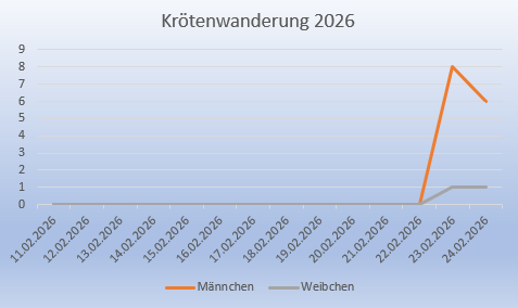 Aufbau des Zaunes am 11. Feb.. Am 22. Feb die ersten Kröten (8m, 1w). Am 24. Feb (7m, 1w). Kontrolle mit der Grundschul AG um 14:30 Uhr: 1m im Tunnel, mehrere Kröten unterhalb des Gitterrostes am Weg.