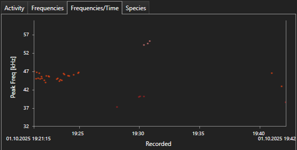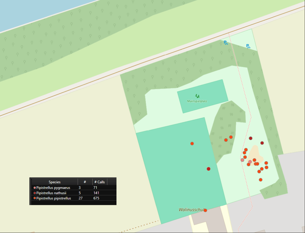 Zuerst tauchten Zwergfledermäuse (Pipistrellus pipistrellus) auf. Es waren mehrere mit sehr vielen Balzrufen. Danach war offensichtlich eine Rauhautfledermaus (Pipistrellus nathusii) unterwegs. Könnte auch eine Weißrandfledermaus (Pipistrellus kuhlii) geqwesen sein? Die beiden Arten lassen sich akustisch nicht unterscheiden und die Weißrandfledermaus soll mainabwärts gerade bei uns einwandern. Am Ende noch die Rufe der Mückenfledermaus (Pipistrellus pygmaeus).