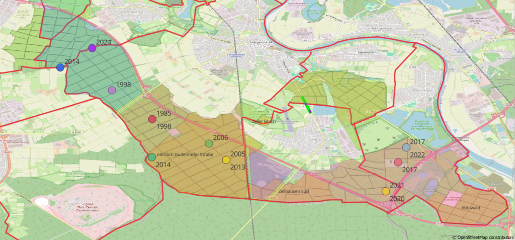 Einzelne Männchen wurden im gesamten Waldbereich nachgewiesen. Wochenstuben befinden sich südlich der Dudenhöfer Straße zwischen Lämmersee Schneise und Gemarkungsgrenze.