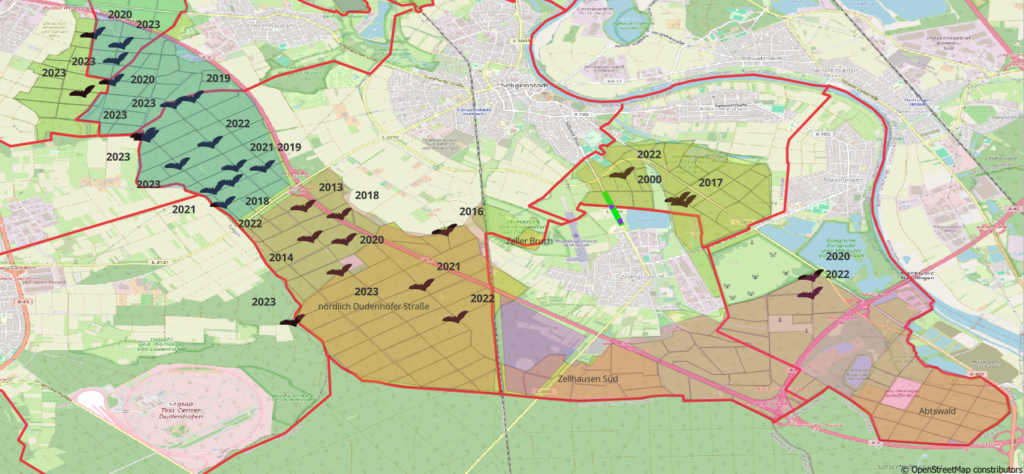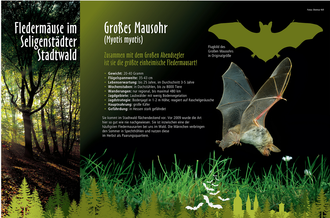 Das Große Mausohr kommt im Stadtwald inzwischen flächendeckend vor. Vor 2009 wurde die Art hier so gut wie nie nachgewiesen. Inzwischen ist sie eine der häufigsten Arten. Die Männchen verbringen den Sommer über in den Fledermauskästen und nutzen diese im Herbst als Paarungsquartiere.