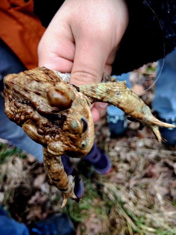 Am Abfangzaun war der Eimer, um die Kröten aufzufangen, leer. Im Tunnel haben wir nach kurzer Zeit ein Männchen gesehen und uns geholt.